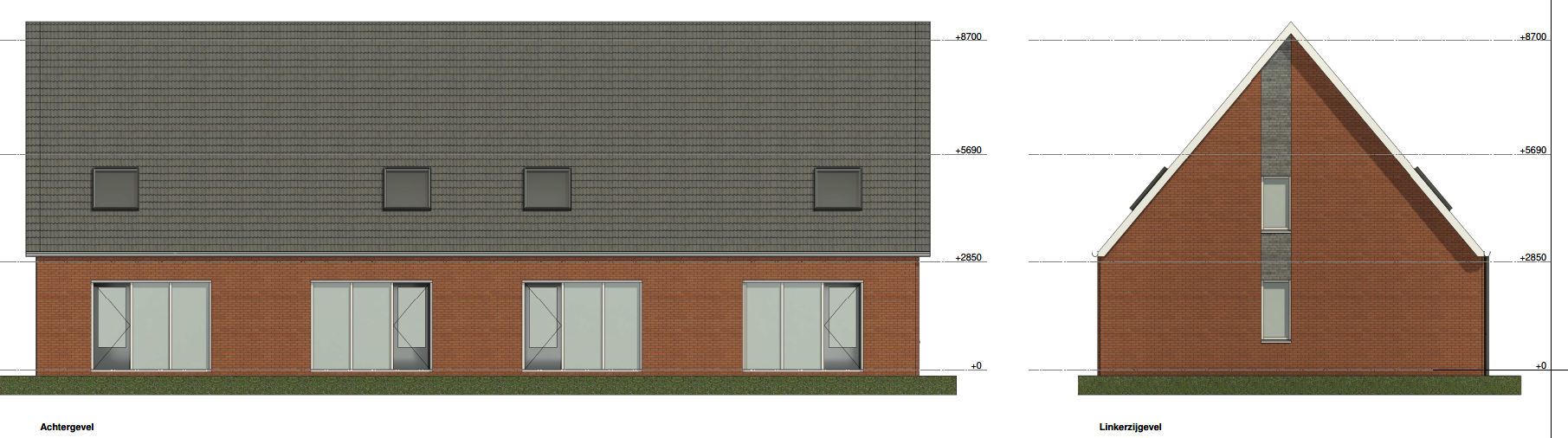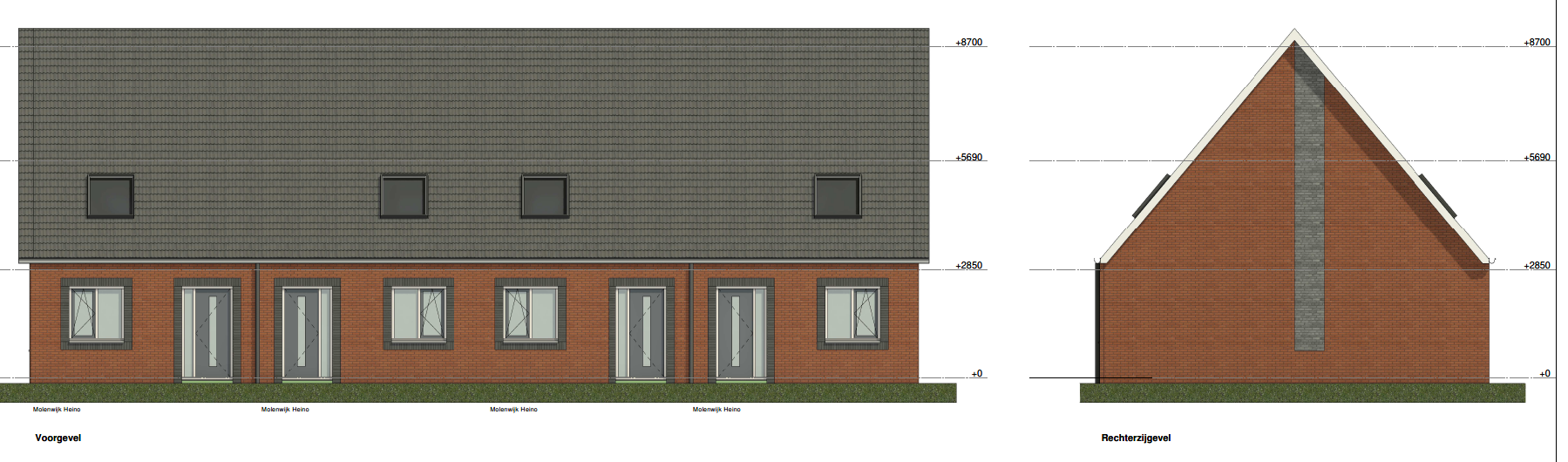 De geveltekeningen van 4 woningen op een rij van blok 1. In de linkerzijgevel zijn ramen aanwezig.