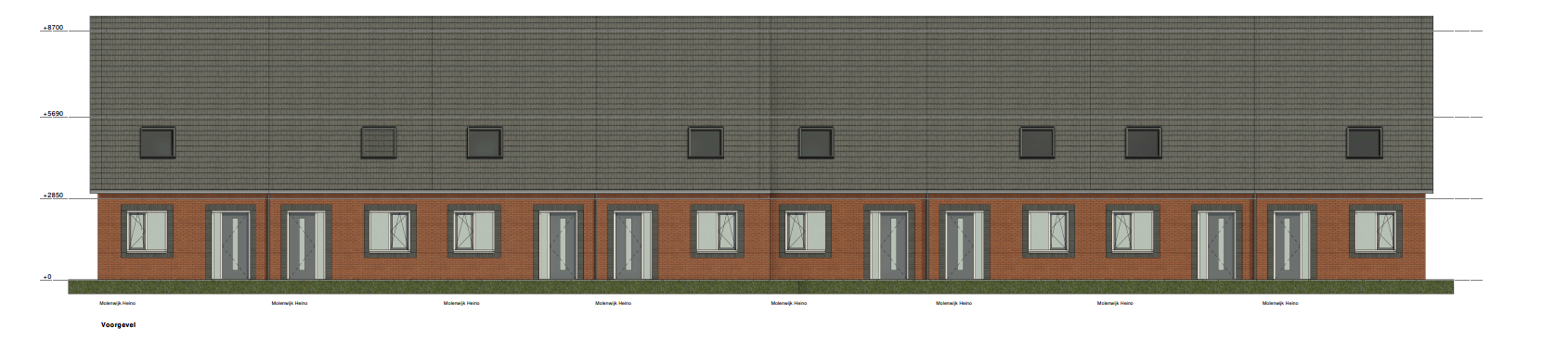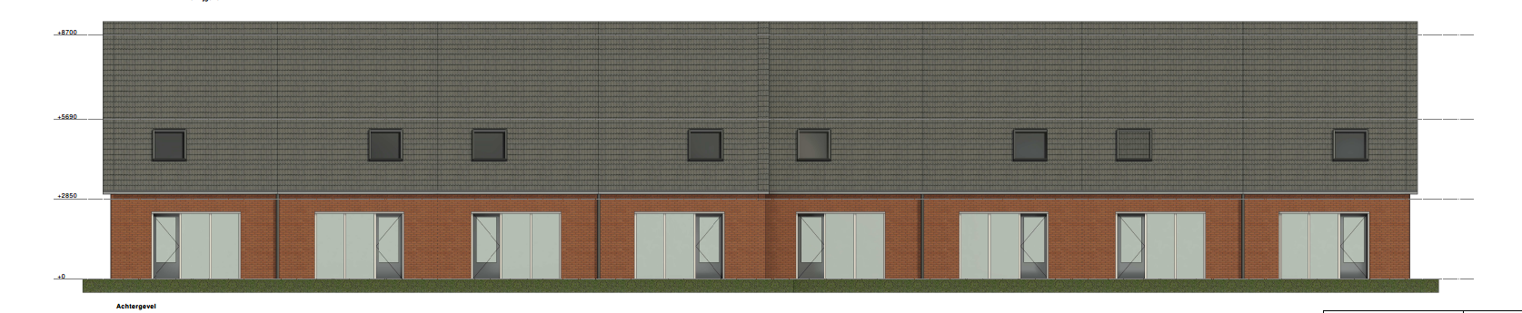 De geveltekeningen van 8 woningen op een rij van blok 2 en 3.
