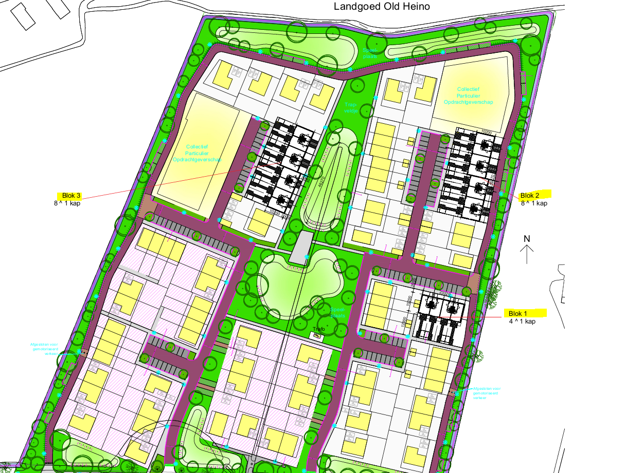 Van blok 1 (met 4 woningen) en blok 2 (8woningen) en blok 3 (8 woningen).