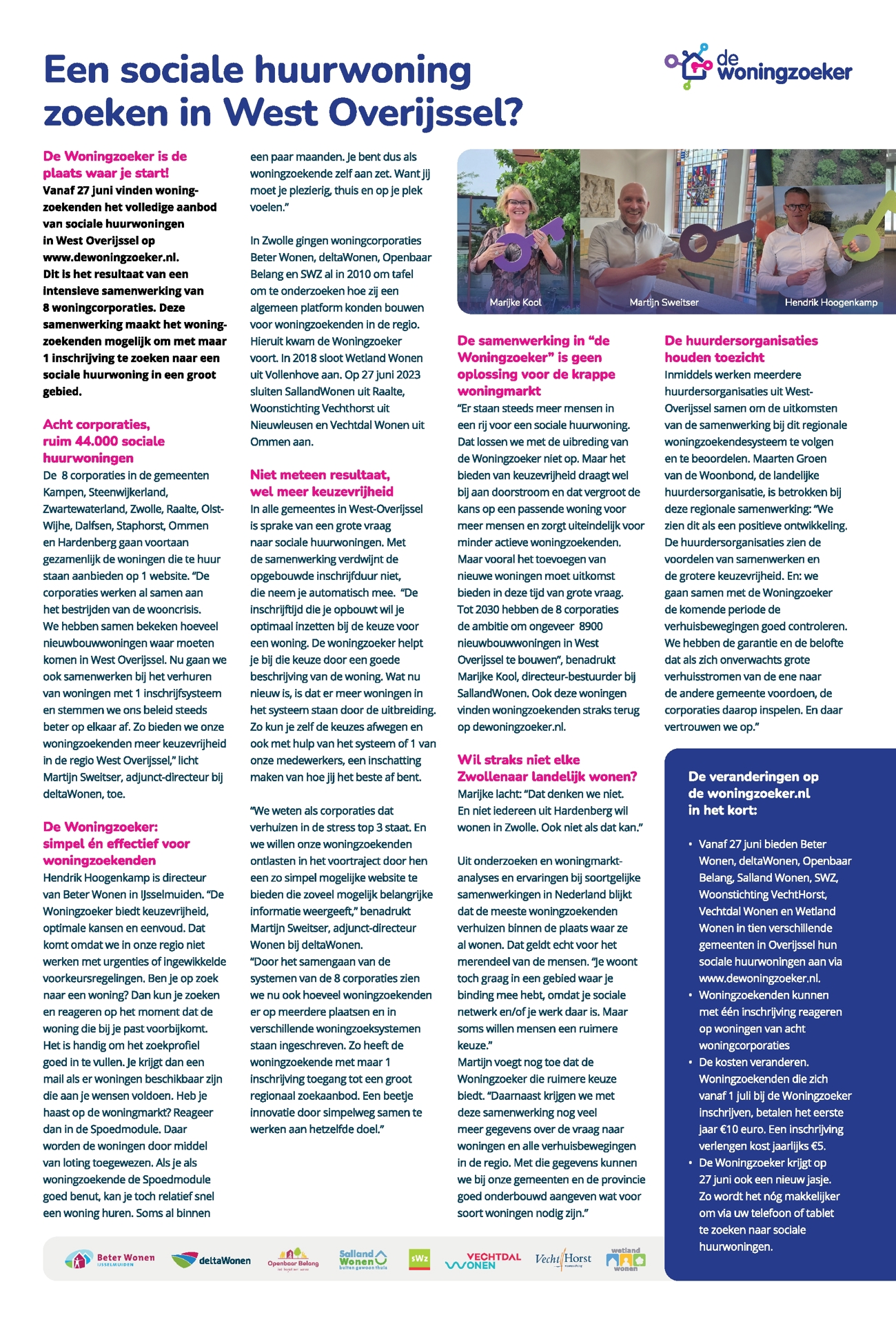 Samen met Woningstichting Vechtdal Wonen en Vechthorst zijn we 27 juni aangesloten bij de Woningzoeker. Daarop werken we nu samen met Beter Wonen IJsselmuiden, deltaWonen, Stichting Openbaar Belang, Woningstichting SWZ en Wetland Wonen.