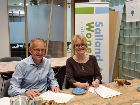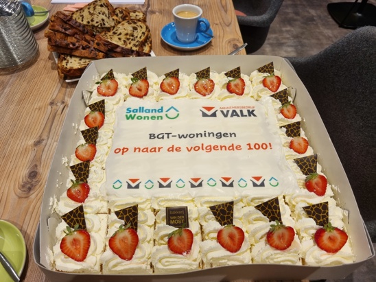 Marijke Kool (directeur bestuurder SallandWonen) heeft samen met Hans Valk, directeur van Aannemersbedrijf Valk een handtekening gezet voor de bouw van 20 woningen op het Franciscushof Zuid - Het Veld. Nu worden er wel vaker handtekeningen gezet maar deze was wel extra speciaal. We gaan met deze handtekening de 100ste BGT woning realiseren samen met Valk. En hiervoor werden we verrast met een heerlijke taart. En zoals Valk op de taart al aangeeft, op naar de volgende 100!
