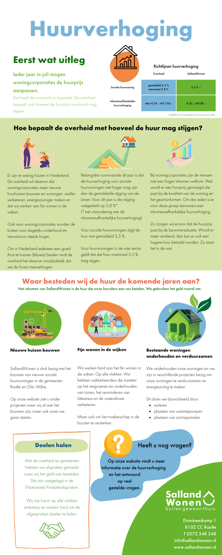 Bij SallandWonen zijn ook de mensen met een hoger inkomen welkom. Wel vragen wij aan hen een huurprijs te betalen die past bij de kwaliteit van de sociale huurwoning en het inkomen. Om die reden is er voor deze groep een inkomensafhankelijke huurverhoging. Zo zorgen wij ervoor dat de huurprijs past bij de bewonerssituatie. Sociale huurwoningen worden verhuurd voor een prijs die lager ligt dan een huurwoning op de ‘vrije markt’. Wordt er meer verdiend, dan kan er ook een hogere huur betaald worden. Zo staat het ook in de wet.