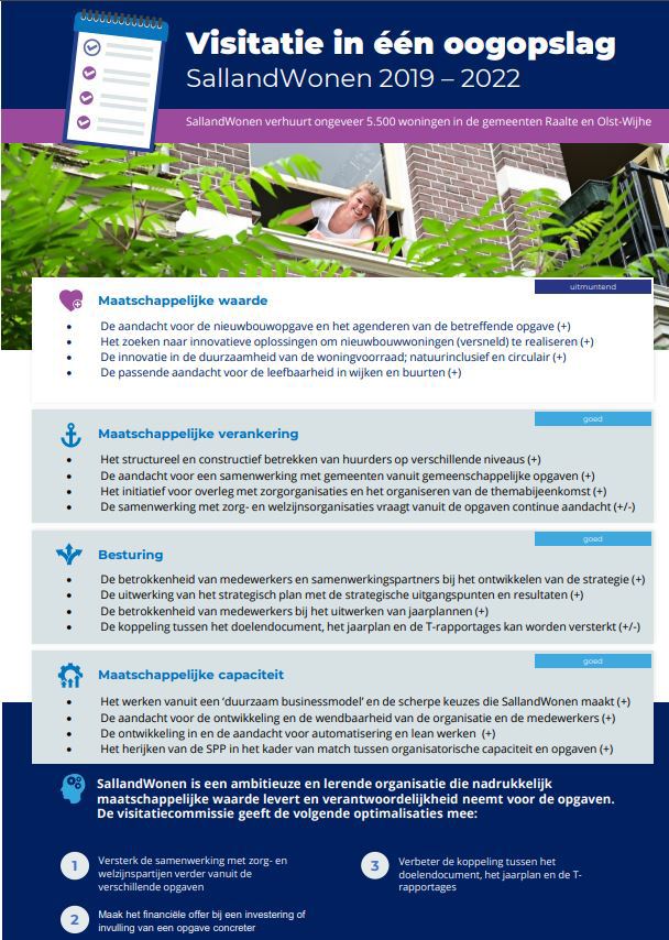 De commissie roemde naast de volkshuisvestelijke prestaties de lokale verankering van SallandWonen en de verbinding met de belanghebbenden. Qua interne organisatie werd de sterke planning en beleidscyclus bevestigd en de goede en actieve manier van verantwoorden.