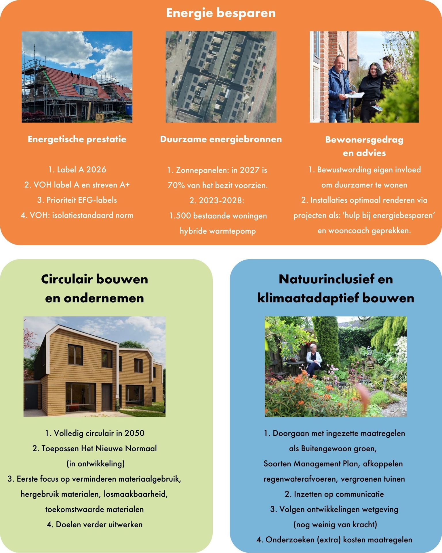 Energie Besparen, Circulair Ondernemen en Bouwen en Natuurinclusief en Klimaatadaptief Bouwen.